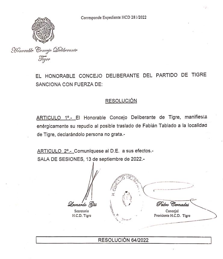 «El honorable concejo deliberante de Tigre manifiesta enérgicamente su repudio al posible traslado de Fabián Tablado a la localidad de Tigre, declarándolo persona no grata» dice la resolución.