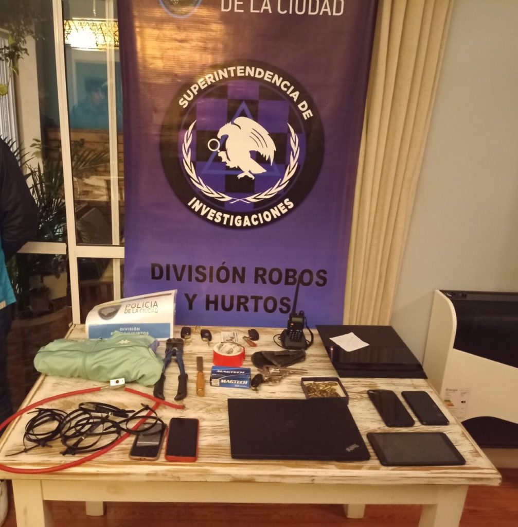 En el allanamiento, los oficiales hallaron una pared falsa en el cielorraso que ocultaba teléfonos celulares (entre ellos el personal), equipos de comunicaciones de tipo “handy”, elementos de efracción (pinza corta candado y lima metálica, utilizados para romper puertas e ingresar a los domicilios) y de reducción de personas (precintos y cintas de embalar), como así también una PlayStation 4 y una campera deportiva utilizada al momento de cometer el robo.