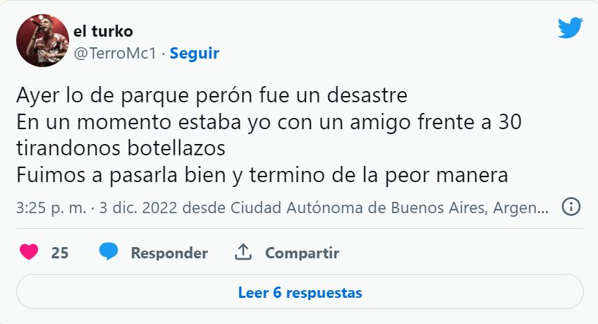«Llegué a la 1.30 del sábado. A eso de las 2 se empezó a llenar y arrancaron a tirar fuegos artificiales -recuerda-. En un momento, le daban a la gente, no sé si porque se cayeron las cañitas o las pusieron así a propósito» le comentó una de las estudiantes a Clarín. Cuando dejaron de tirar, empezaron las peleas. Además se robaron gorras y relojes.
