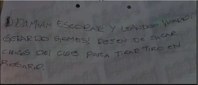 “Damián Escobar, Leandro Vinardi y Gerardo Gomes: Dejen de sacar chicos del club para tirar tiros en Rosario” decía el papel que estaba pegado al cuerpo de Lorenzo Altamirano, un joven de 28 años que apareció asesinado en la puerta de la cancha de Newell’s Old Boys en Rosario.