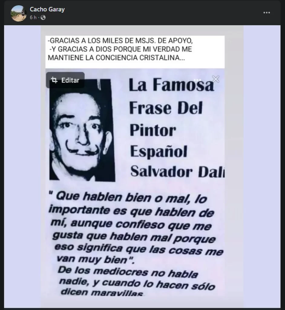 En la imagen con la que acompañó el posteo incluyó una frase que se le atribuye al pintor español Salvador Dalí: «Que hablen bien o mal, lo importante es que hablen de mí, aunque confieso que me gusta que hablen mal, porque eso significa que las cosas me van muy bien. De los mediocres no habla nadie, y cuando lo hacen solo se dicen maravillas».