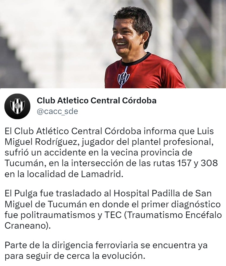 Desde Central Córdoba (SdE), por su parte, informaron lo mismo: «Luis Miguel Rodríguez, jugador del plantel profesional, sufrió un accidente en la vecina provincia de Tucumán, en la intersección de las rutas 157 y 308 en la localidad de Lamadrid. El Pulga fue trasladado al Hospital Padilla de San Miguel de Tucumán en donde el primer diagnóstico fue politraumatismos y TEC (traumatismo encéfalo craneano). Parte de la dirigencia ferroviaria se encuentra ya para seguir de cerca la evolución».