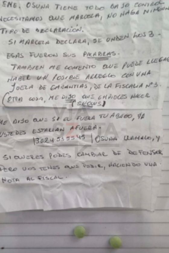 «Eme, Osuna tiene todo bajo control. Necesitamos que Marcela no haga ningún tipo de declaración. Si Marcela declara, se hunden los tres. Esas fueron sus palabras. También me comentó que puede llegar a haber un posible arreglo con una jueza de garantías de la Fiscalía N° 3». Así comienza el escrito que los agentes secuestraron según información publicada por diariochaco.com.