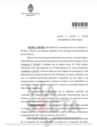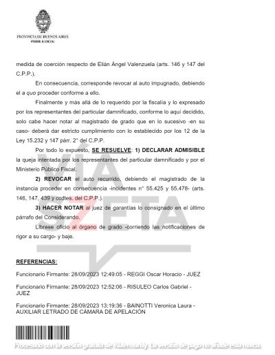 Además, advierten que «no habiéndose incorporado elemento alguno que amerite la reconsideración del medio coercitivo decretado en su oportunidad, consideramos que no corresponde hacer lugar al cese de la medida de coerción respecto de Elián Ángel Valenzuela».