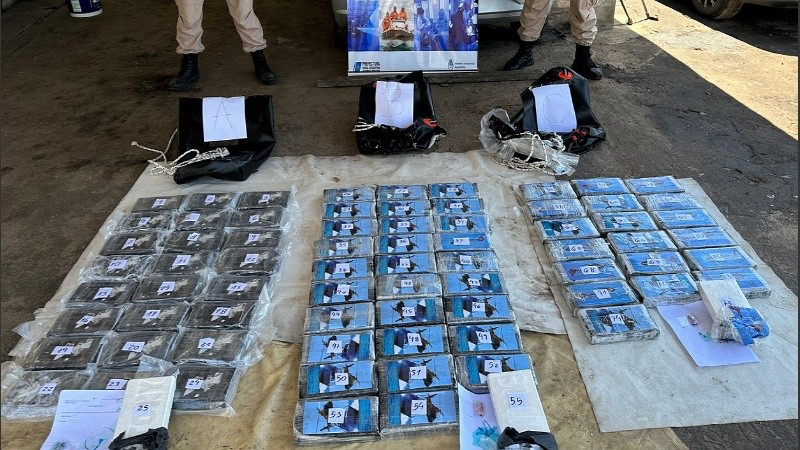 Horas más tarde, pero en la localidad de Arroyo Seco, personal de la Prefectura encontró otro bulto flotando en el río con otros 25 paquetes y un peso total de 27 kilos.