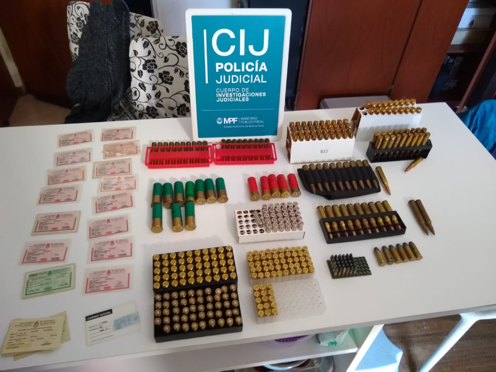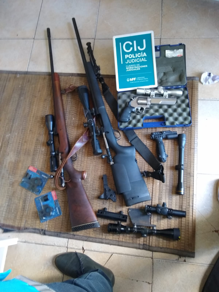 En el procedimiento, realizado por personal del CIJ y la División Investigaciones de Armas y Explosivos Ilícitos de la Policía de la Ciudad, secuestraron 15 credenciales de tenencia de armas vencidas (en su mayoría pistolas semiautomáticas de distintos fabricantes), un fusil Máuser modelo Arg 1909 con mira telescópica colocada, un fusil Tactical negro también con mira colocada, una mochila conteniendo cajas de municiones varias, un revólver calibre 44 Magnum Smith & Wesson con mira telescópica, otras dos miras telescópicas, un accesorio símil láser, un pistolgrip y dos accesorios tipo guías.
