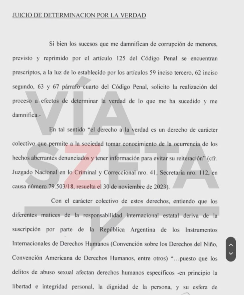 En la denuncia dejaron claro que: «los sucesos que me damnifican de corrupción de menores (…) se encuentran prescriptos». Sin embargo, solicitaron la realización de un juicio por la verdad de «lo que me ha sucedido y me damnifica».