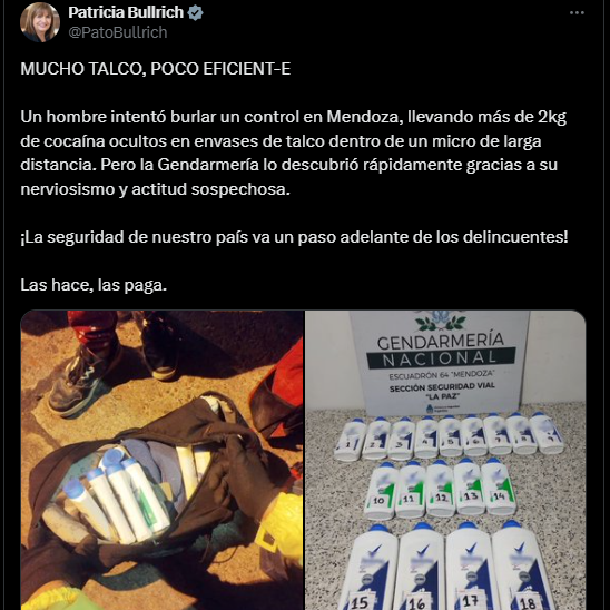 Gendarmería informó el pasado 2 de octubre la detención de un hombre que, supuestamente, traficaba cocaína. La captura, según el comunicado que llegó a los medios de comunicación, había sido en un colectivo que viajaba de Mendoza hacia Buenos Aires. Incluso la ministra replicó el anuncio desde sus redes sociales.