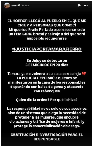 La artista utilizó sus redes sociales para denunciar el crimen, visibilizar la violencia de género que azota a Jujuy y repudiar la represión policial sufrida por vecinos y familiares que se manifestaron exigiendo justicia. “Nos matan y encima nos reprimen cuando salimos a gritar que nos están matando”, escribió con furia y angustia.